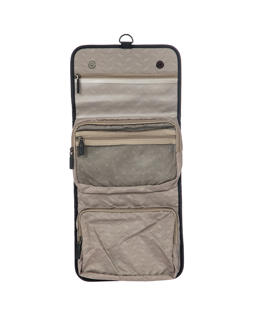 Эта косметичка выполнен из ткани (полиамида), обработанный водоотталкивающими средствами, имеет застежку-гвоздик с двумя магнитами и логотип Bric's в центре. Имеет три кармана на молнии и прозрачный сетчатый карман, а также практичный крючок, который позволяет вертикально подвешивать несессер для удобного и легкого доступа к туалетным принадлежностям.