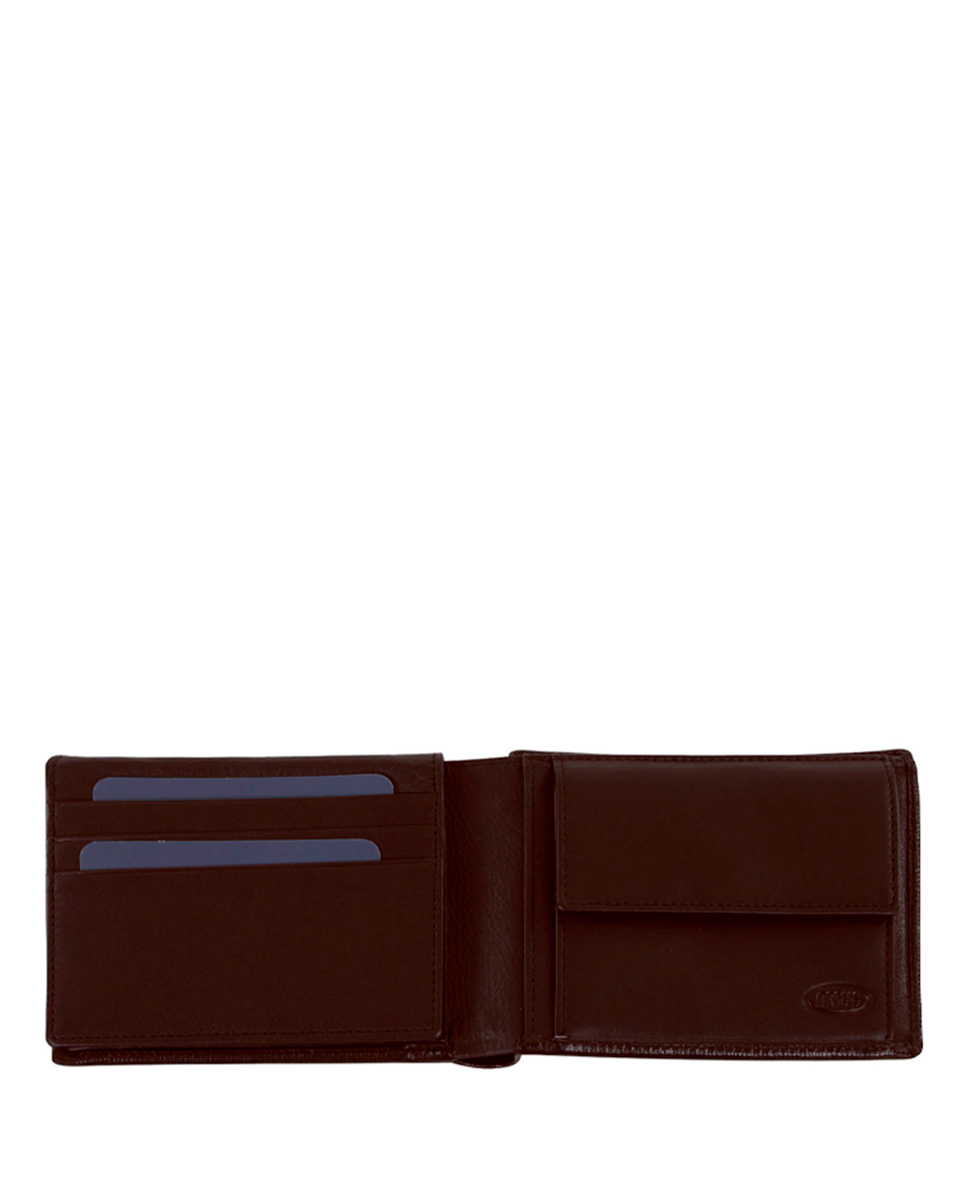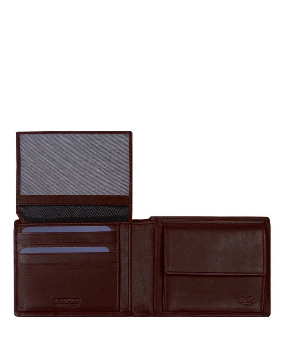 Кожаный мужской кошелек с клапаном, прозрачной папкой для документов, карманом для монет, двойным отделением для банкнот и элегантной внутренней подкладкой с геометрической текстурой. Кошелек оснащен системой RFID для защиты данных вашей карты от попыток кражи. 100% Кожа
