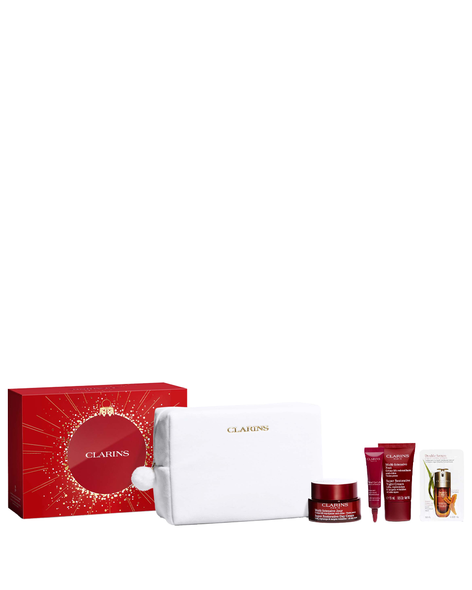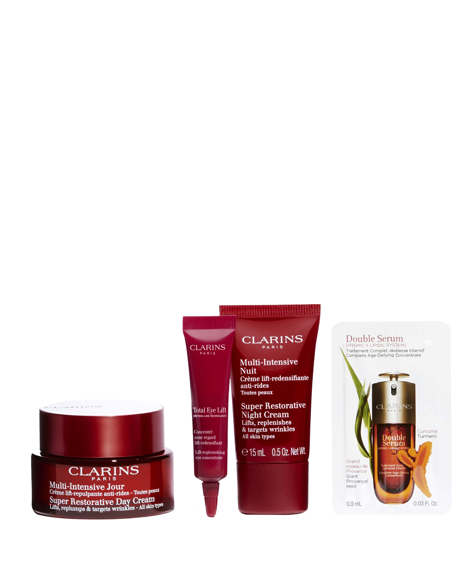 В набор входит: cупер dосстанавливающий дневной крем 50 мл + крем для подтяжки кожи вокруг глаз Total Eye Lift 7 мл + супер восстанавливающий ночной крем 15 мл + двойная сыворотка Essential Care 0,9 мл.
