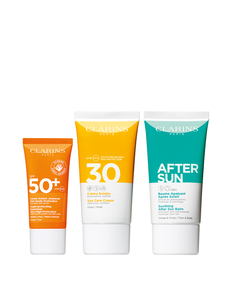 В набор входит: солнцезащитный крем для лица SPF 50+ 30 мл + солнцезащитный крем для тела SPF 30 75 мл + солнцезащитный бальзам после загара 75 мл.