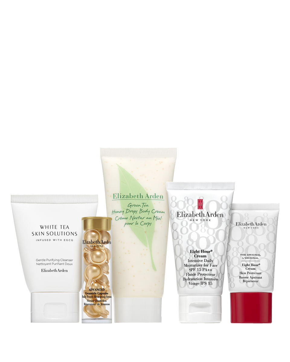 В набор входит: Состав набора: нежное очищающее средство White Tea Skin Solutions, 50 мл + ежедневный восьмичасовой интенсивный увлажняющий крем SPF 15, 50 мл + сыворотка для ежедневного восстановления молодости в капсулах с керамидами, 14 капсул + крем для тела с каплями зеленого чая и меда, 100 мл + восьмичасовой крем для защиты кожи, 15 мл.