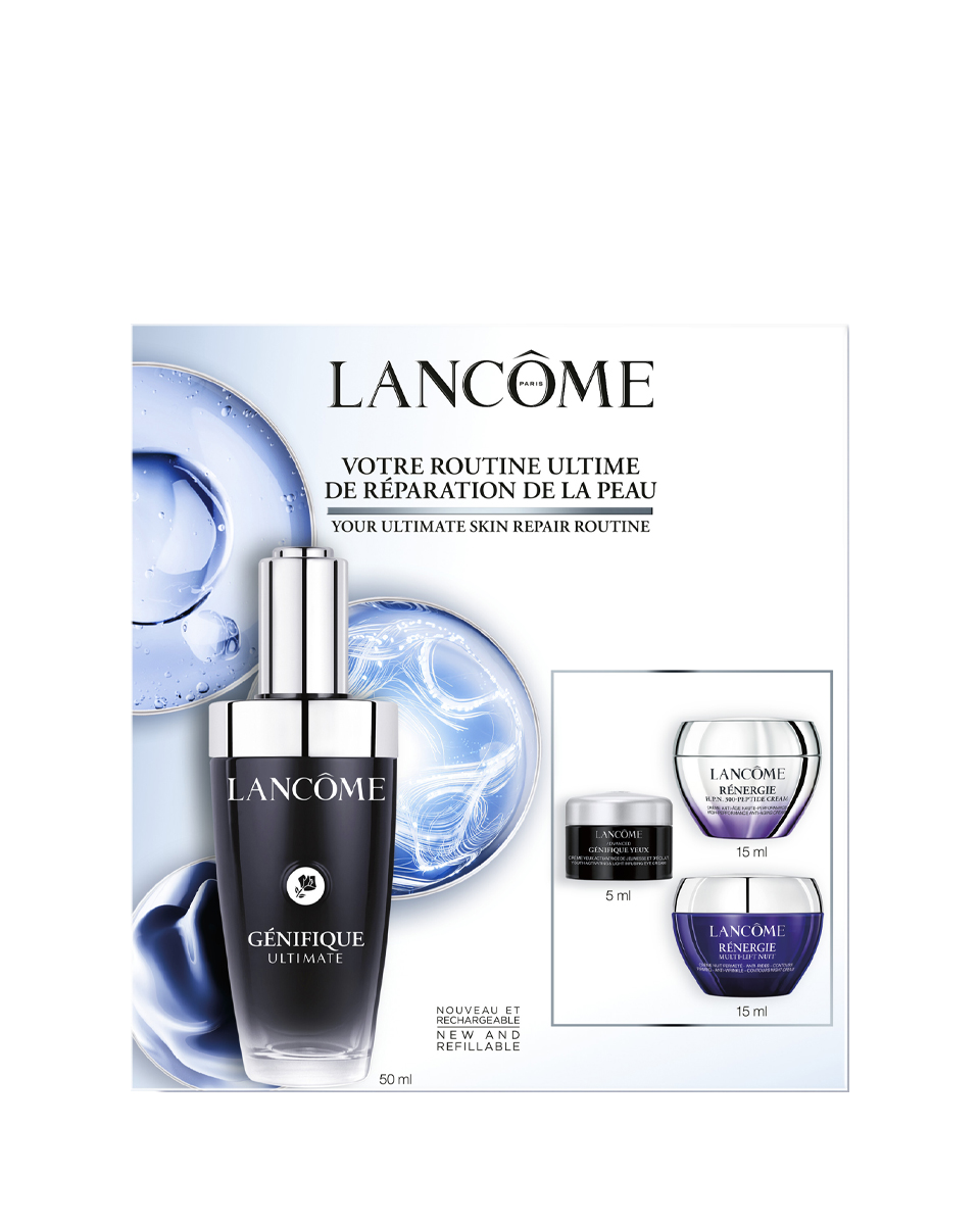 В набор входит: ночной крем Renergie Multi-Lift 15 мл + крем для век Genifique 5 мл + дневной крем Renergie Multi-Lift 15 мл + сыворотка Genifique 50 мл.