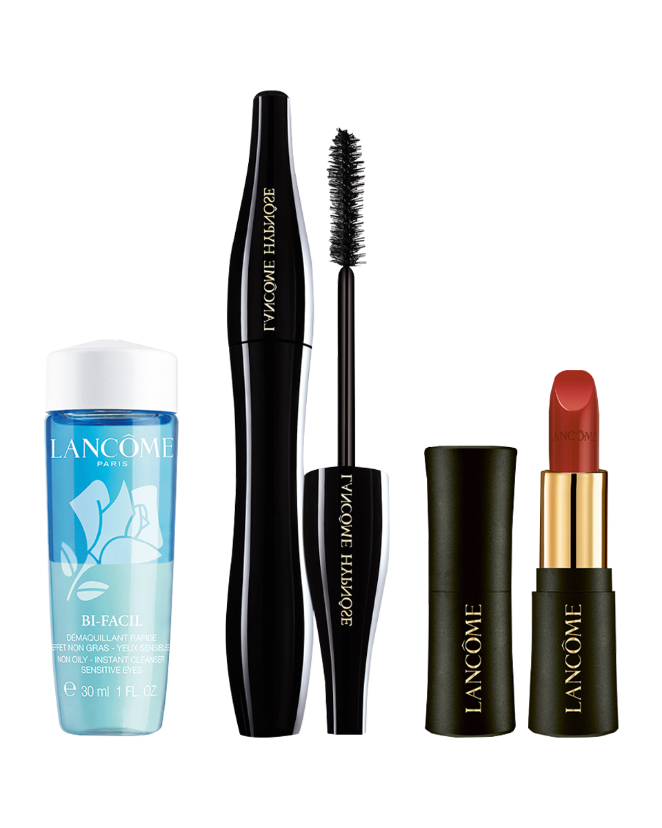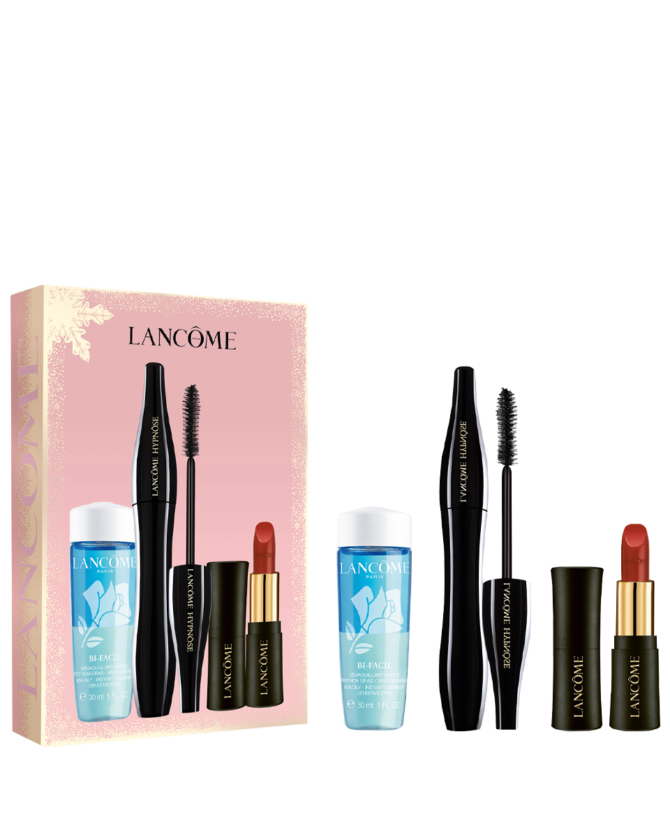 В набор входит: тушь для ресниц Hypnose № 01 Black + двухкомпонентное средство для снятия макияжа с глаз 30 мл + губная помада L'Absolu Rouge Mini № 391.
