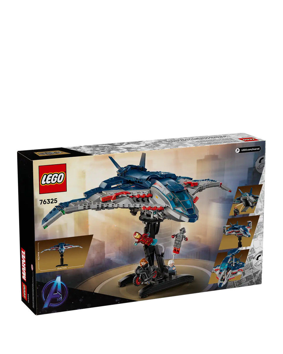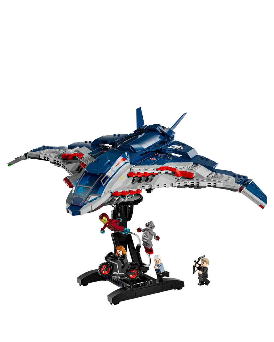 В комплект к сборному самолету Quinjet входят 5 минифигурок: Черная вдова с мотоциклом, Железный человек, Ртуть, Альтрон и Соколиный глаз со своим луком и стрелами. Минифигурки можно прикрепить в разных местах самолета. У Quinjet есть открывающаяся кабина, 2 стрелковых отделения спереди и место для хранения оружия Black Widow и лука Hawkeye. Задняя дверь открывается, чтобы дети могли садиться на мотоцикл и выходить из него. В комплект поставки входит съемная вращающаяся подставка, обеспечивающая обзор легендарного самолета на 360 градусов. Для дополнительного удовольствия конструкторы могут увеличивать масштаб, поворачивать модели в 3D и отслеживать прогресс с помощью увлекательного и интуитивно понятного приложения LEGO Builder.