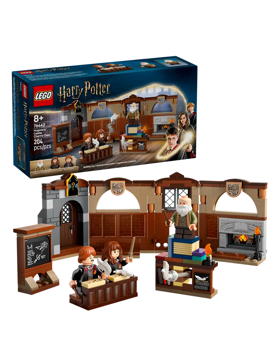 В сборном классе Хогвартса, который складывается для удобства игры, есть функция левитации перьев Wingardium Leviosa, съемные парты для учеников, съемная классная доска с инструкциями по заклинаниям и многое другое. В эту волшебную игрушку также входят персонажи LEGO Harry Potter – Рон Уизли™, Гермиона Грейнджер™ и профессор Флитвик, которые позволяют разыгрывать неограниченное количество увлекательных историй.