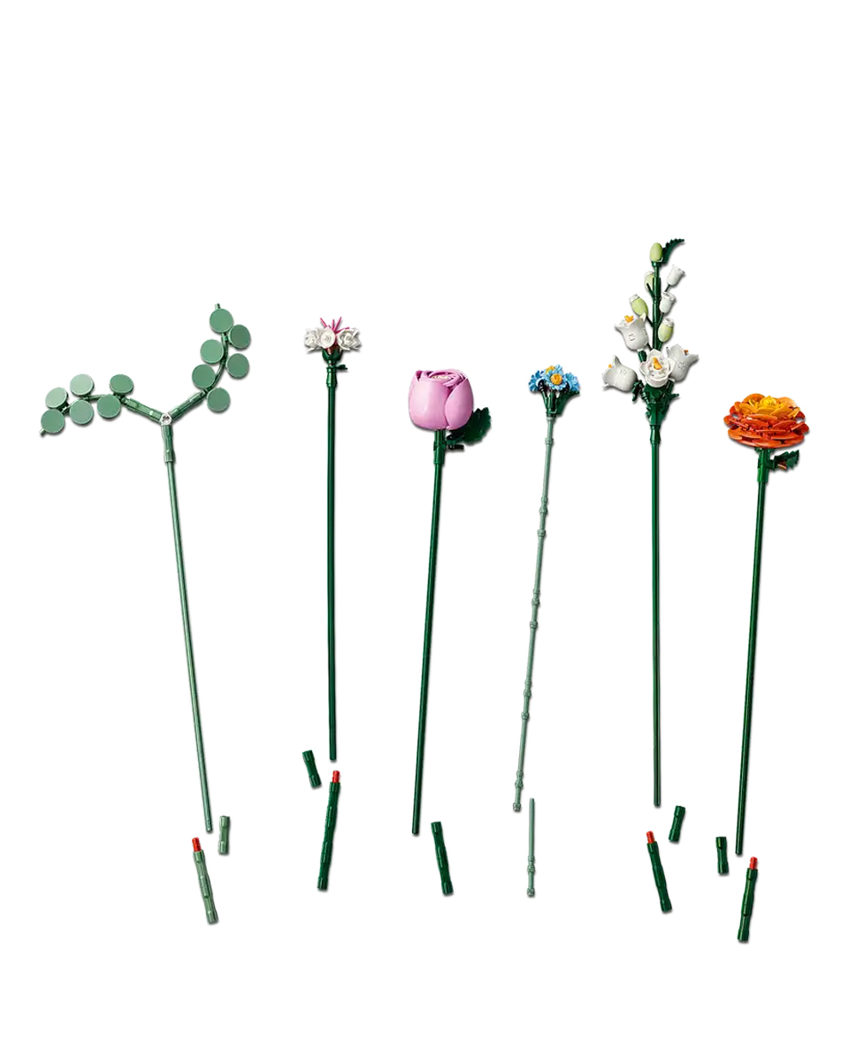 Начинающие флористы могут расслабиться, собирая букет, который состоит из 15 цветочных стеблей LEGO, включая маргаритки, васильки, эвкалипты, цветы бузины, розы, ранункулусы, орхидеи цимбидиум, водяную лилию, георгин и колокольчик. Все стебли регулируются, что позволяет изготовителям составить индивидуальный букет, который они смогут использовать в качестве цветочного декора для дома или офиса.