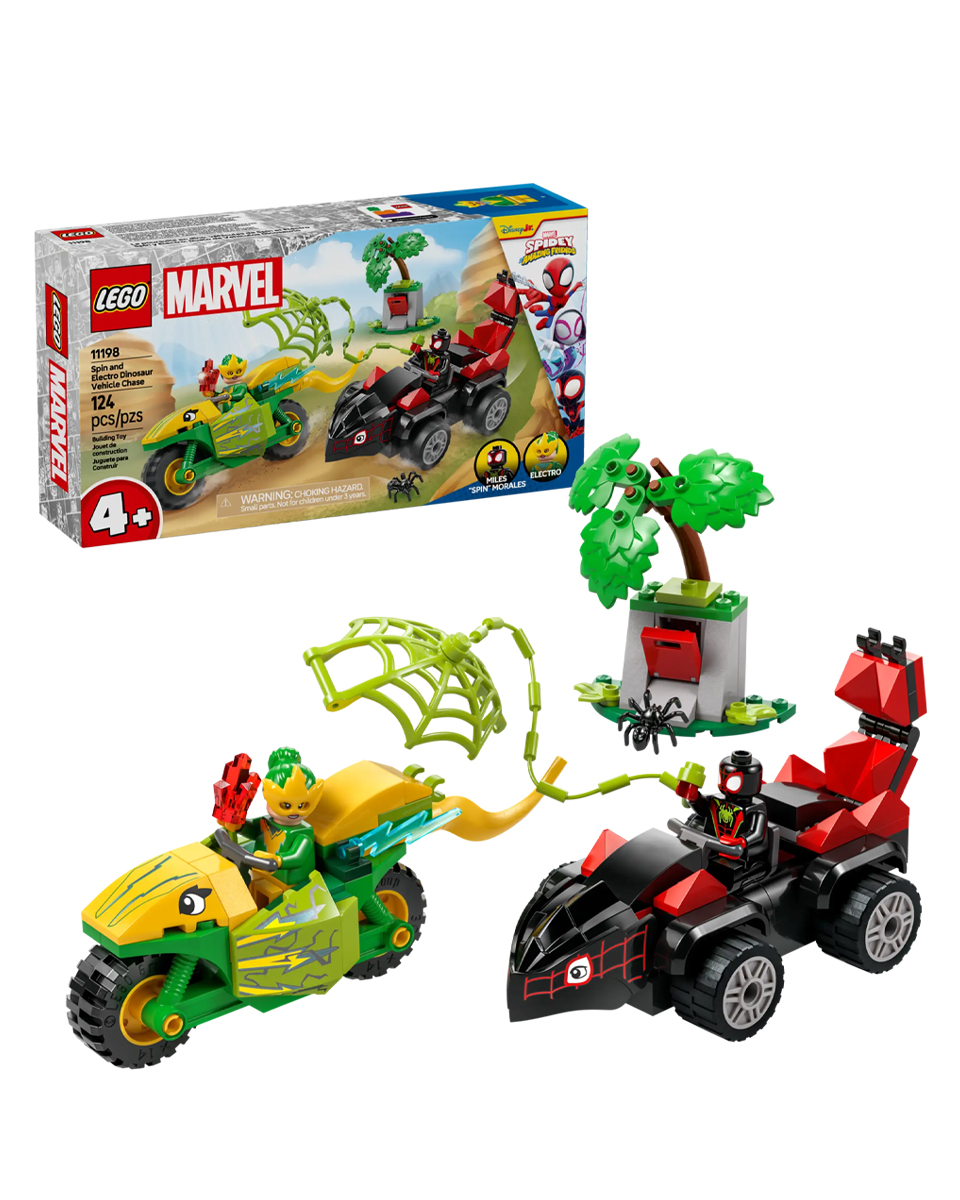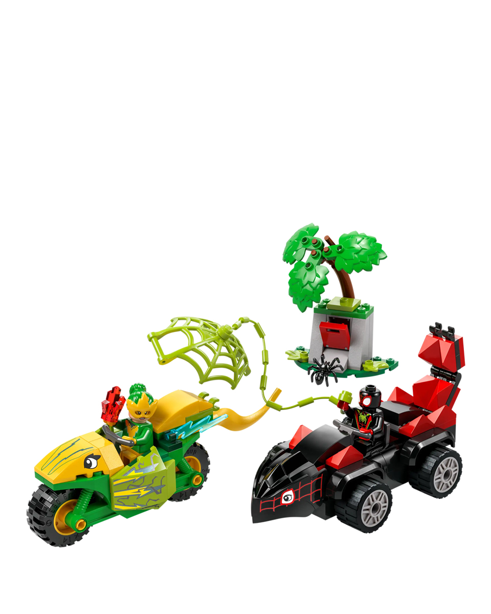 В набор входят 2 минифигурки супергероев и 2 динозавромобиля: Майлз "Спин" Моралес на машине-стегозавре и Электро на мотоцикле-дилофозавре. Большой элемент из паутины, кристалл, спрятанный в камне, а также аксессуары для ландшафтного дизайна.