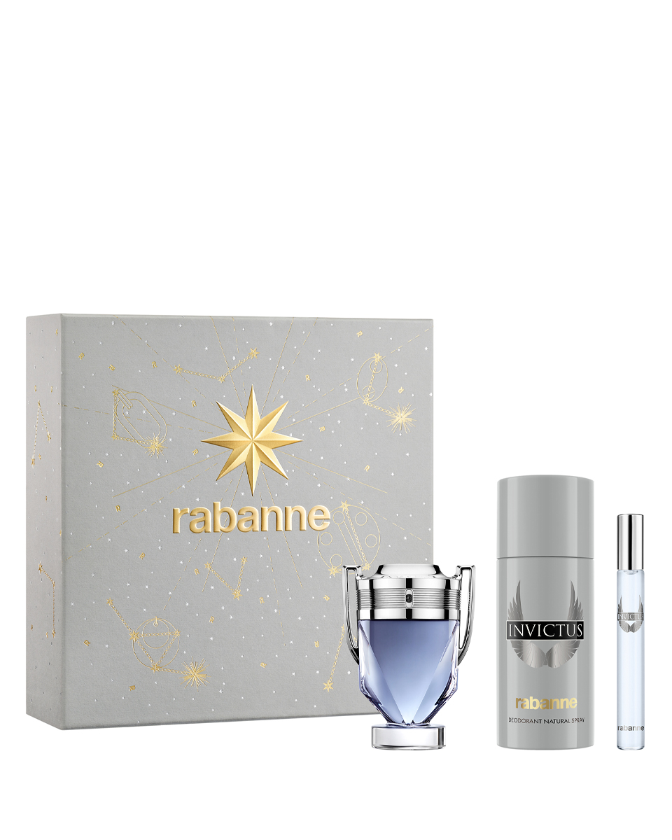В набор входит: туалетная вода Paco Rabanne Invictus 50 мл + дезодорант-спрей Paco Rabanne Invictus 150 мл + туалетная вода Paco Rabanne Invictus 10 мл.