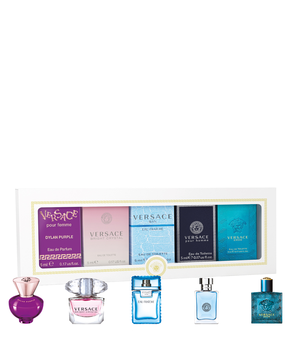 В набор входит: парфюмерная вода Dylan Purple 5 мл + туалетная вода Bright Crystal 5 мл + туалетная вода Eau Fraiche 5 мл + туалетная вода Pour Homme 5 мл + туалетная вода Eros 5 мл.