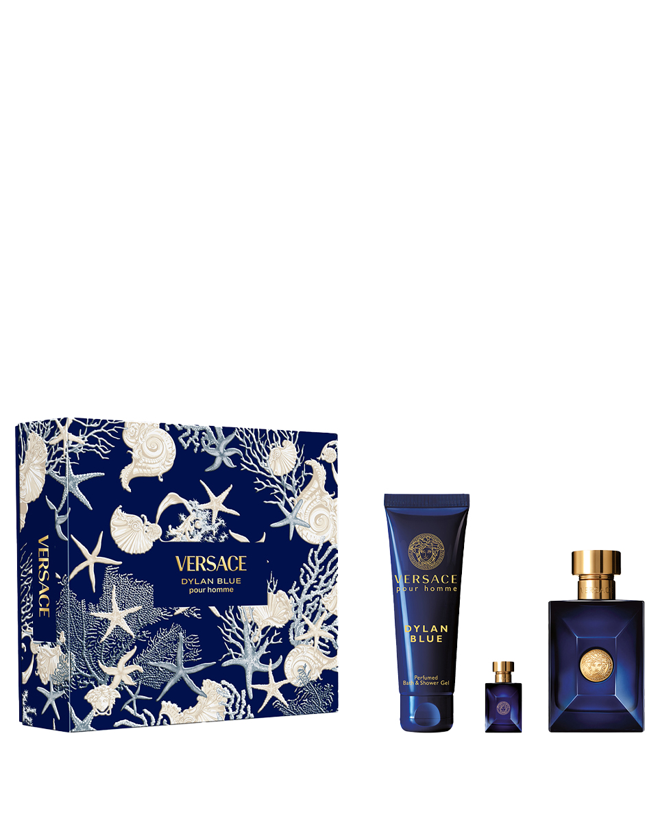 В набор входит: туалетная вода Versace Dylan Blue 100 мл + гель для ванны и душа Versace Dylan Blue 150 мл + туалетная вода Versace Dylan Blue 5 мл.